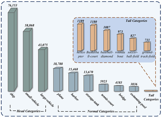 Unlike natural images, in remote sensing images, due to the detected categories being severely imbalanced and the angle distribution of objects being random, it is usually necessary to use rotated rectangular boxes to accurately represent them. Due to the dense arrangement of objects, the dataset in remote sensing images exhibits an inherent long-tail distribution. The categories occupying the top are usually a few densely arranged categories, while most other categories only occupy a small part of the dataset.