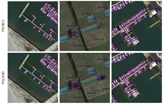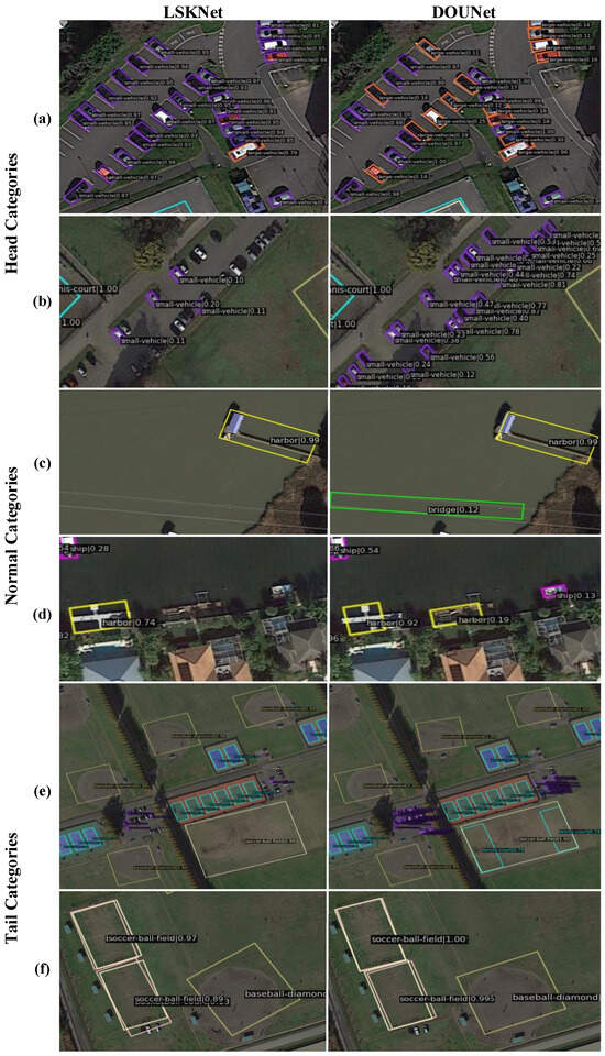 Qualitative visualization results of LSKNet and DOUNet. (a,b) Visualization of detection results for head categories, with purple representing small vehicles and orange red representing large vehicles. (c,d) Visualization of normal categories, lemon yellow for harbor and pink for ship. (e,f) Visualization of tail categories, sky blue for tennis-court, yellow for baseball-diamond, white for basketball-court, light pink for soccer-ball-field.