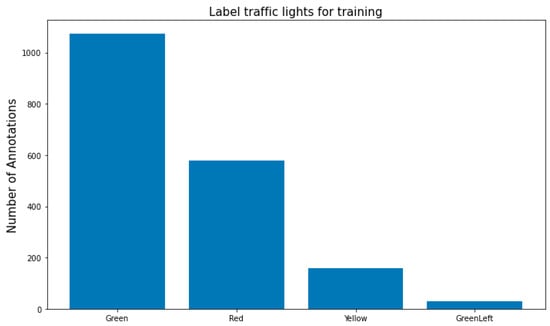 In actual deliveries, the drivers usually chose to take the route with green lights and the smoothest flow. Due to time constraints for every deployment of tasks, drivers often tried to avoid red lights to prevent delays. Fleet managers were also concerned about the number of times drivers ran red lights. This sparked an interest in traffic lights, and the objects were also considered from full front images to small traffic lights. Based on data information in Table 2, the total image data was 1837, with 1480 for training and 357 for validation. In this study, all 1837 collected images contain traffic lights, with classes including green, red, yellow, and green left turn lights. The number of annotations included 1073 for green, 579 for red, 157 for yellow, and 28 for green left turn in Figure 3. According to the traffic light image annotations, the number of annotations was greater than red lights, yellow, and green left turns. According to the number of traffic lights, it is necessary to add annotations to these four lights.