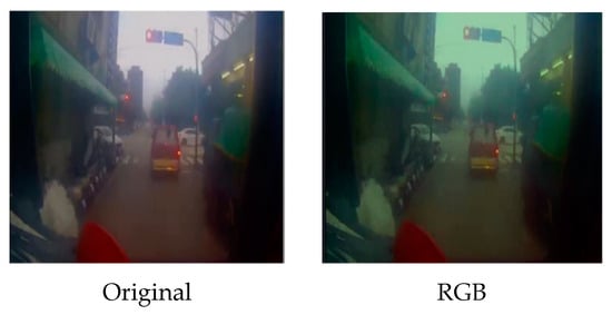 This study selected the most challenging poor-quality images from among 33 with resolutions smaller than HD as an example. This study required addressing the pre-processing through image enhancement. Image pre-processing involved adjusting images to fixed width and height dimensions and reducing the size of the image. If images were cropped, some information could be lost. Due to three different resolutions, this study resized all images to the same width and height size (1:1). In practice, fleet managers usually observed the color images and adjusted their light and contrast. With one low-resolution case from 33 as an example, to adjust images using RGB factors, the R factor provided was 0.8, the G factor was 1.0, and the B factor was 0.8 as an example in Figure 4. The advantages of RGB conversion were that it was simple, its relative ease of color-mixing calculations, and that it allowed for the adjustment of the final color exhibition. However, as shown in Figure 4, the limitation of RGB was that it was difficult to make localized adjustments. The result of RGB was for global adjustments and was not suitable for this low-resolution case.