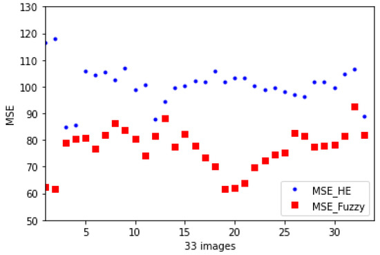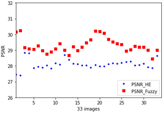 This study listed 33 poor-quality images in Figure 7 and Figure 8. The MSE values of fuzzy enhancement (Fuzzy) were smaller than the MSE values of histogram equalization (HE). The PSNR values of fuzzy enhancement were higher than the PSNR values of histogram equalization in Figure 8.