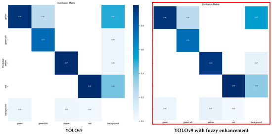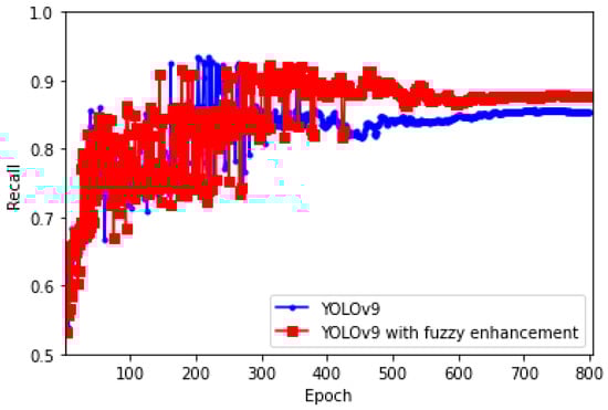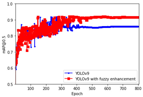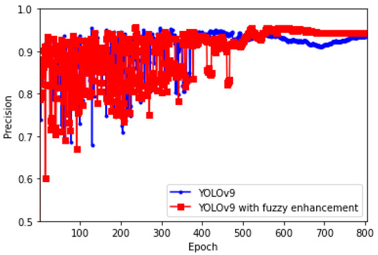Although a larger number of epochs tends to stabilize the model, it is evident that the model is affected by three different resolutions. Too many epochs can take a lot of time. Previous studies did not specify how many epochs to set; typically, fewer than 500 is a threshold. Increasing the number of epochs would increase the training time and cost. From this, it is evident that pre-processing needed to be utilized. We enhanced 33 poor-quality images and added these 33-to-1480 data, which were 1513 images using YOLOv9, called YOLOv9 with fuzzy enhancement. Classical data-augmentation methods commonly enhance an image by adjusting its grayscale distribution. The fleet managers analyzed the traffic light images and determined that they need to use the original color images rather than converting them to grayscale. The histogram equalization enhancement, which belongs to classical data, as provided in Table 6. Moreover, while using customized manual and other classical data-augmentation methods, such as contrast, saturation, cropping, and brightness adjustments, for individual images can provide multiple adjustment combinations for model training, eventually yielding better performance, it requires a significant amount of time and resources. This approach is not practical for fleet management, as it would require more manpower, making it unsuitable for practical applications. When we added 33 images after fuzzy enhancement to the original 1480 images, making a total of 1513 images for annotations and model training, Figure 9 shows that the precision results of YOLOv9 with fuzzy enhancement on epoch > 600 is higher than YOLOv9. The same results of recall and the recall results of YOLOv9 with fuzzy enhancement on epoch > 450 are higher than those of YOLOv9 in Figure 10. In Figure 11, as the epoch increased, both YOLOv9 and YOLOv9 with fuzzy enhancement stabilized, with the result of YOLOv9 with fuzzy enhancement reaching above 0.9.