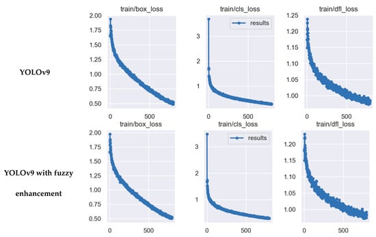 For model training, the results of YOLOv9 with fuzzy enhancement still required more epochs to achieve stability. In this study, we chose a batch size of 8, and YOLOv9 and YOLOv9 with fuzzy enhancement used 800 epochs completed in 17.009 h (YOLOv9) and 17.361 h (YOLOv9 with fuzzy enhancement) using YOLOv9-c (complex). For all classes, YOLOv9 with fuzzy enhancement had the better results for precision, recall, mAP@0.5, and mAP@0.5:0.95. Figure 12 shows the loss curves for YOLOv9 and YOLOv9 with fuzzy enhancement.