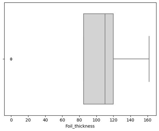 The presence of outliers in the dataset can be definitively attributed to data entry errors. This conclusion is based on the recorded values for foil thickness associated with the outlier observations (0.023 micron), which do not align with the company’s specified foil material specifications. Therefore, these outliers are considered error outliers, reflecting significant deviations from expected values due to inaccuracies in the data collection process [32].