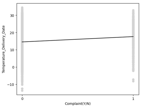 Table 5 summarizes the point-biserial correlation coefficient values () and their corresponding p-values, which assess the relationship between the independent continuous variables and the target variable. These values offer insights into the strength and significance of the associations. Additionally, Figure 3 displays a point-biserial scatter plot illustrating the relationship between the continuous variable “Temperature_Delivery_Date” and the target variable “Complaint (Y/N)”, providing a visual representation of their relationship.