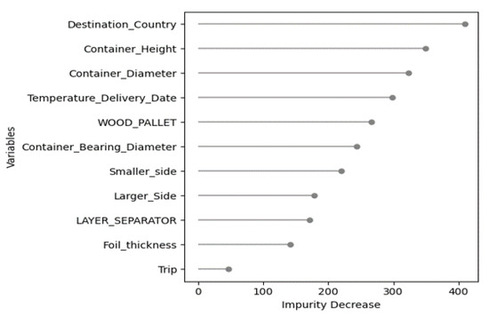 The relative importance of features was assessed by calculating the average Impurity Decrease across all 103 trees in the model. The analysis identified “Destination_Country” as the most influential variable in the prediction task, followed closely by the “Container_Height”, “Container_Diameter”, and “Temperature_Delivery_Date” features. These findings are visually represented in Figure 5. The high importance of features like “Destination_Country” and “Container_Height” can be linked to the inherent logistics and handling challenges in different regions and the physical dimensions of the cargo, respectively. This insight is critical for logistics companies to understand where to focus their efforts in securing cargo during transit.