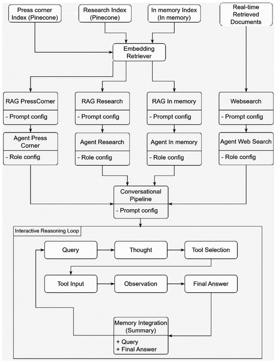 To enhance our framework, we propose a multi-agent system where the RAG pipelines are configured as agent tools, resulting in the implementation of a conversational virtual assistant agent. Each agent has its own configuration, including selecting an applicable LLM (e.g., GPT-4o), setting stop words accordingly (e.g., “Observation:”), and specifying model parameters. Each tool is customarily assigned a role (e.g., “Press Corner” → “useful for when you need to answer questions about the Press Corner website of the European Commission”). Additionally, we incorporated memory using the summary model philschmid/flan-t5-base-samsum [33], accessed from Hugging Face [34], for interactions between the user and the virtual assistant, allowing for follow-up and more specific questions based on previous conversations, utilizing any LLM preferred by the user.