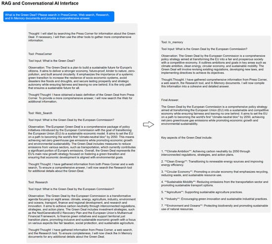 The thought process of the conversational pipeline, which was enabled by Haystack’s framework, applied a systematic and iterative approach to assembling comprehensive information about the Green Deal from multiple sources, adjusting its query to each subsequent source and seeking additional details and different perspectives to ensure a thorough and multi-faceted answer, all of which are initiated from the prompt configuration [36], as presented in Table 1. Initially, as the user suggested, it started with a broad query to Press Corner, obtaining a foundational understanding of the Green Deal and recognizing that the initial information provided a basic definition. After obtaining the initial information, it recognized the need for more comprehensive data and shifted to Web Search, refining the query to gather specific policy details and goals. With foundational and policy information obtained, it moved to Research to acquire detailed descriptions of the various focus areas and investment strategies, enriching the overall understanding. Lastly, it queried In Memory to capture strategic initiatives, objectives, and regulatory aspects, ensuring all essential elements were included.