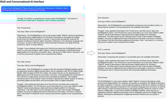 Regarding the “What is the EU4DigitalUA” example, it adjusted its query to each subsequent source, seeking additional details and different perspectives to ensure, as requested, a thorough and multi-faceted answer initiated from the prompt configuration, as presented in Table 1. Initially, as the user suggested, it started with a query to Press Corner, obtaining foundational and detailed information about the EU4DigitalUA project, specifically highlighting the “DigiUni” initiative to develop a digital platform for Ukrainian universities. Recognizing that this provided an educational perspective, it shifted to Web Search and querying to gather broader context and specific details about the project’s role in Ukraine’s digital transformation and its integration with the EU Digital Single Market. With these critical aspects covered, the pipeline moved to Research. However, this step did not yield additional information, indicating that the topic was not included in the related index that the Research Agent used. Lastly, it queried In-Memory documents, which did not provide further details, suggesting that the uploaded document was unrelated to the EU4DigitalUA. Despite these gaps, the process ensured that all available information was included by integrating insights from the Press Corner and web search, resulting in a comprehensive understanding of the EU4DigitalUA project.