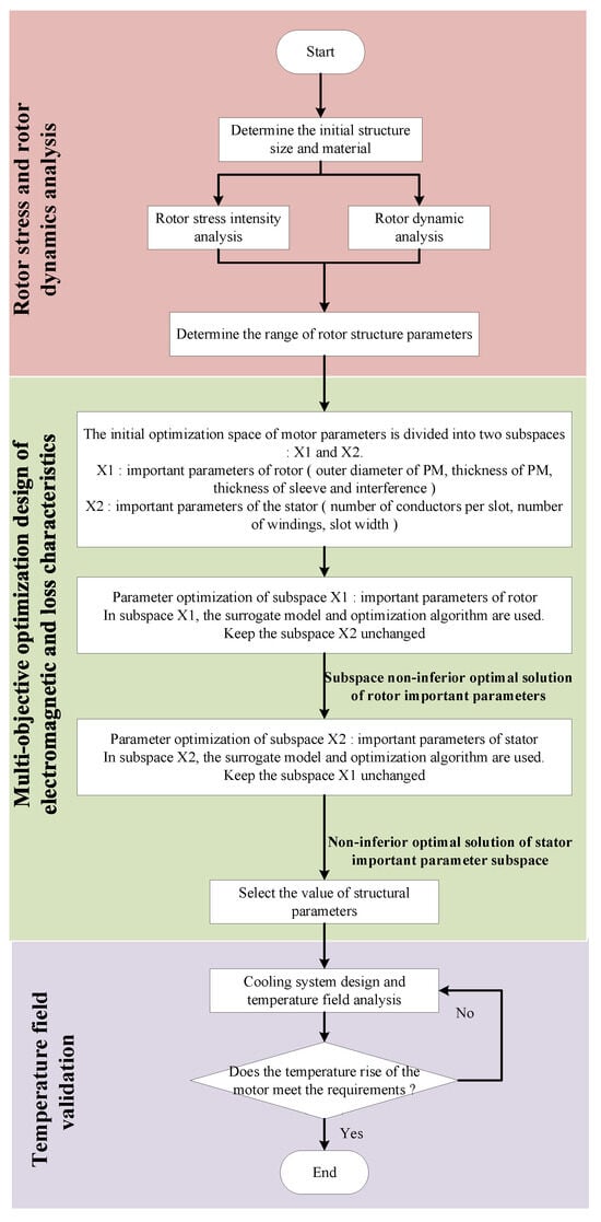 Based on the aforementioned analysis, this study incorporates a multi-physics optimization design methodology for HPMSM, which leverages a subspace and sequential optimization strategy. Firstly, the rotor performance of HPMSM motor is considered, the rotor stress intensity, such as PM stress distribution and sleeve stress distribution, is analyzed, and the value range of rotor main parameters is defined []. On this basis, the electromagnetic performance and loss characteristics of the motor for multi-objective optimization design. Finally, through the heat dissipation system design and temperature field verification [,], the final multiphysics optimization design scheme is improved. The overall design flow chart is shown in Figure 1.