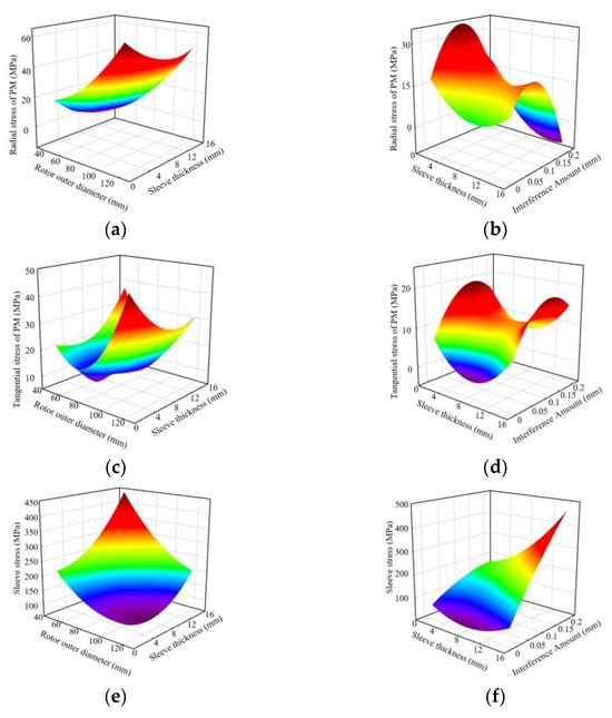 The rotor stress surrogate model of the HSPMM. (a) The effect of rotor outer diameter and sleeve thickness on the radial stress of PM. (b) The effect of rotor sleeve thickness and interference amount on the radial stress of PM. (c) The effect of rotor outer diameter and sleeve thickness on the tangential stress of PM. (d) The effect of sleeve thickness and interference amount on the tangential stress of PM. (e) The effect of rotor outer diameter and sleeve thickness on the sleeve stress. (f) The effect of sleeve thickness and interference amount on the sleeve stress.