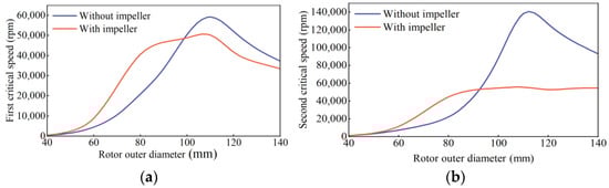 Dynamic rotor models with impeller and without impeller are established by using 3D finite element method. The first-order and second-order critical speeds of rotor under different rotor outer diameters are analyzed, as shown in Figure 4 below. In this analysis, the rotor temperature is set to 110 °C. It can be seen from the figure that the first-order and second-order critical rotational speeds of the rotor gradually increase with the increase of the rotor’s outer diameter. In the stage of smaller rotor outer diameter, that is, when the rotor outer diameter is 40~80 mm, the first-order critical rotational speed of the rotor with impeller increases rapidly. When the rotor outer diameter is 80~100 mm, the first-order and second-order critical rotational speeds of the rotor without impeller gradually exceed those of the rotor with impeller. When the rotor outer diameter is greater than 100 mm, the first-order and second-order critical speeds of the rotor without impeller are higher than those of the rotor with impeller, and the first-order and second-order critical speeds of the two kinds of rotors decrease to some extent. In this paper, the rated speed of HSPMM is 30,000 rpm, rigid rotor is adopted, and the safety factor is 0.75. The first-order critical speed of rotor with impeller should be greater than 40,000 rpm, and the outer diameter of rotor should be in the range of 80~120 mm to meet the requirements of rotor dynamics.