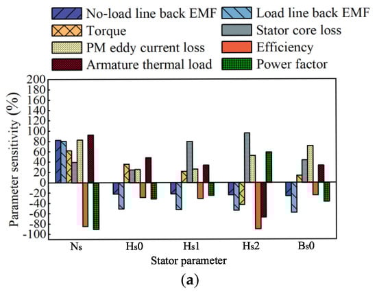 Before electromagnetic performance and loss multi-objective optimization design of HSPMM, sensitivity analysis of main optimization parameters is carried out using a finite element model, and correlation coefficients of each optimization parameter to different optimization objectives are obtained. In this paper, Pearson correlation coefficients are used to express the influence of each optimization parameter on different optimization objectives. The sensitivity of relevant structural parameters is calculated as shown in Figure 5.