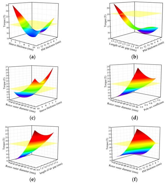 According to the design requirements, the rated torque of the motor is 19.1 Nm, which is indicated by the light-yellow plane, as shown in Figure 6. As shown in Figure 6a,b, with the increase of sleeve thickness, the output torque first decreases and then increases, while with the increase of permanent magnet thickness, the output torque first increases and then decreases. When the sleeve thickness is greater than 7 mm, the equivalent air gap length of the motor is too large to ensure sufficient excitation magnetic field, so sufficient electromagnetic torque cannot be obtained. As shown in Figure 6c,d, as the outer diameter of the rotor increases and the thickness of the sleeve decreases, the output torque gradually increases. However, as the outer diameter of the rotor increases and the pole arc coefficient increases, the output torque gradually increases. As shown in Figure 6e,f, the output torque of the motor gradually increases as the rotor outer diameter and the air gap length gradually increase, and at the same time, the output torque of the motor also increases as the rotor outer diameter and the permanent magnet thickness gradually increase. However, in the three optimization variables of rotor outer diameter, permanent magnet thickness and air gap length, rotor outer diameter has the most significant influence on motor output torque, which is consistent with the results of parameter sensitivity analysis.