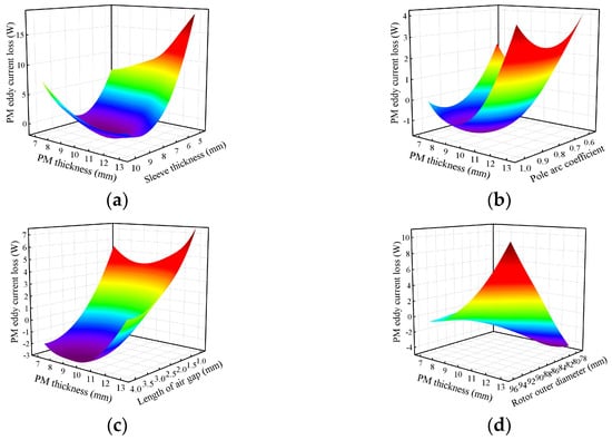 The response surface of permanent magnet loss. (a) The effect of PM thickness and sleeve thickness. (b) The effect of PM thickness and pole arc coefficient. (c) The effect of PM thickness and length of air gap. (d) The effect of PM thickness and rotor outer diameter.