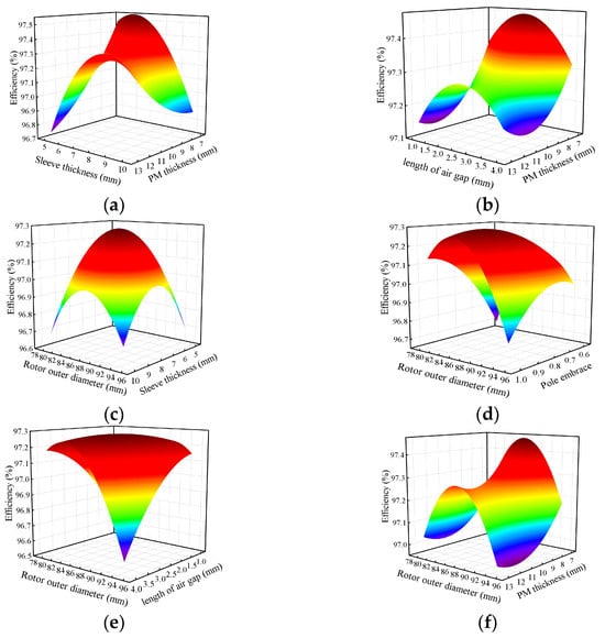 The response surface of efficiency. (a) The effect of sleeve thickness and PM thickness. (b) The effect of length of air gap and PM thickness. (c) The effect of rotor outer diameter and sleeve thickness. (d) The effect of rotor outer diameter and pole embrace. (e) The effect of length of air gap and rotor outer diameter. (f) The effect of length of air gap and PM thickness.