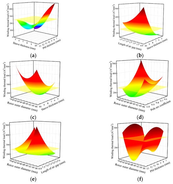 The response surface of thermal load. (a) The effect of sleeve thickness and PM thickness. (b) The effect of length of air gap and sleeve thickness. (c) The effect of rotor outer diameter and sleeve thickness. (d) The effect of rotor outer diameter and pole arc coefficient. (e) The effect of rotor outer diameter and length of air gap. (f) The effect of rotor outer diameter and PM thickness.