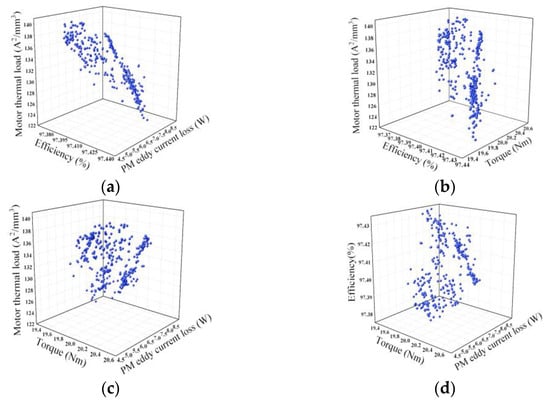 The Pareto solutions of stator parameters subspace. (a) The Pareto solutions of PM eddy current loss, efficiency and motor thermal load. (b) The Pareto solutions of torque, PM eddy current loss and motor thermal load. (c) The Pareto solutions of torque, PM eddy current loss and efficiency. (d) The Pareto solutions of torque, efficiency and motor thermal load.