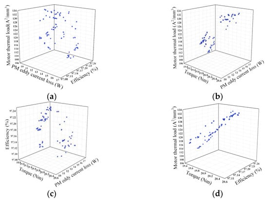 The Pareto solutions of rotor parameters subspace. (a) The Pareto solutions of efficiency, PM eddy current loss and motor thermal load. (b) The Pareto solutions of efficiency, torque and motor thermal load. (c) The Pareto solutions of torque, PM eddy current loss and motor thermal load. (d) The Pareto solutions of torque, PM eddy current loss and efficiency.