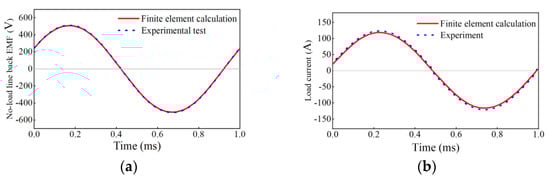 The comparison of the FEA results with the experimental results. (a) No-load line back EMF. (b) Load current.