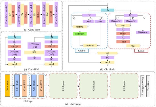 - Output module. The output module consists of a global average pooling layer and a linear classifier. The overall structure of CloFormer is depicted in Figure 5d, wherein a CloLayer is composed of a combination of two Clo blocks and a ConvFFN, with downsampling incorporated in the ConvFFN of the final layer.