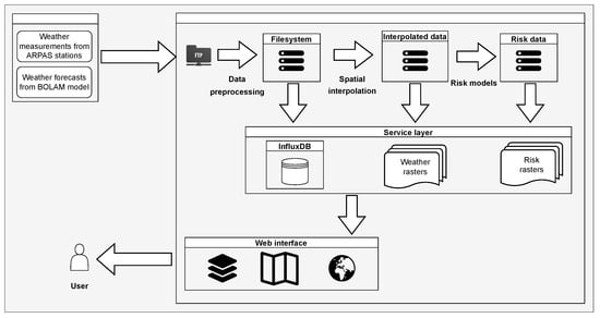 This section briefly illustrates the entire back-end workflow, from the preprocessing of measured and forecast weather data to the generation of raster files with risk indices and their storage on the CRS4 filesystem. Notably, all analysis components are performed fully automatically and in near real time.