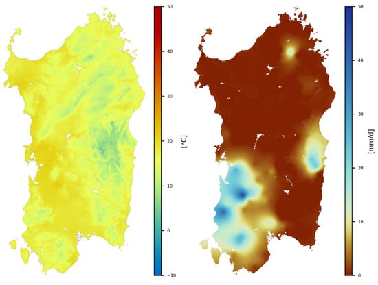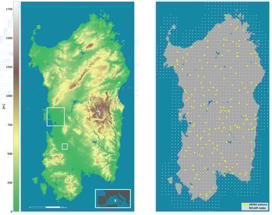 ARPA Sardegna collects the measurements sent by the Regional Meteorological Network (Rete Unica Regionale—RUR). The network comprises 109 thermo-pluviometric stations and 77 meteorological stations, totaling 186 stations (Figure 2, right) distributed throughout the island, typically installed near population centers. In addition to the sensors, the network includes the instrumentation required for data transmission via radio or GPRS/UMTS, a series of radio repeaters, and the two data acquisition stations located in Cagliari and Sassari. The thermo-pluviometric stations provide measurements of air temperature () and precipitation (), while the meteorological stations, in addition to the aforementioned measurements, also supply relative humidity (), global solar radiation (), and wind speed () at above the soil. While the calibration and maintenance of the station instruments is outsourced to specialized third parties, the Meteoclimatic Department of ARPA Sardegna is responsible for the quality control of the above measurements and for their processing into hourly and daily time series. The quality control of weather measurements adopts standard and automated data validation criteria such as physical consistency (i.e., the recorded values must fall within the expected range) and climatological consistency (as above, but relative to the typical climate of the region under consideration), temporal consistency (i.e., variations between consecutive readings), and persistence of measurements. On the other hand, spatial consistency check is performed manually and almost daily by comparing the measurements of neighbouring stations. All of the above quality control procedures generate validation flags that are attached to the data, thus denoting the level of reliability of the measurements. The data along with the corresponding validation codes are then stored in a relational database. Dedicated software therefore extracts only the validated data and prepares the files to be delivered daily to CRS4 via an FTP server. Consequently, barring sensor and transmitter malfunctions, thousands of measurements are collected daily by CRS4.