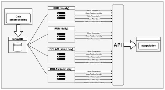 A schematic description of the InfluxDB time-series-oriented database storing the weather measurements from the RUR network and BOLAM forecasts. After preprocessing, the data are put into the database and organized into measurements and fields. Then, the data become available for the interpolation techniques by query via API.