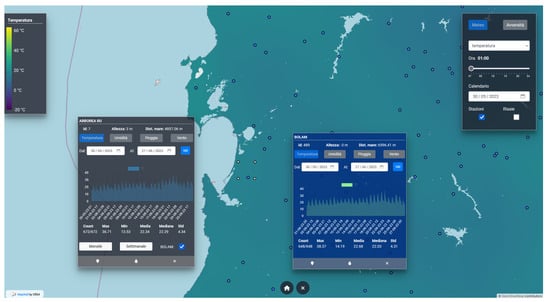 Temperature distribution for a selected geographic window at a specific day and time. Enabling the “Station” flag displays all stations (shown as blue dots) within the window. Detailed variations of the selected variable are shown for each station (dark popup), along with the relative trend of the value from the nearest BOLAM grid point (blue popup). The white dots represent the location of the 4 nodes of the BOLAM model closest to the selected station.