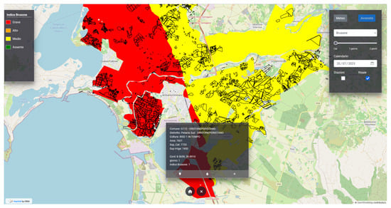 The front-end includes a browser-based GIS application that represents the geographical area of interest and visualizes data from various sources, such as numerical series, shapes, and rasters. Users can locate meteorological stations and nearby BOLAM grid points. For each station or BOLAM node, the time series of selected meteorological variables—temperature, relative humidity, and rainfall—can be retrieved from the InfluxDB database and displayed in a dedicated popup window. Users can also compare values between different points. The front-end is divided into two areas: “Weather”, which displays maps with meteorological indicators, and “Pests and Diseases”, which visualizes risk maps. Examples and screenshots from both areas will be shown in Section 3. Here, we mention that users can view both raster maps and time series of either measured weather variables (sampled up to ) or forecasts for the next days, both at hourly intervals (see Figure 4). In the “Pests and Diseases” section, users can view rasters associated with the 3-day rice blast (“brusone”) risk maps for the paddy fields at different resolution levels, along with supplementary information on the rice crops and the selected farm. An example is shown in Figure 5 for 12 July 2023. Similarly, detailed and interactive graphical outcomes are provided for locust egg hatching, as illustrated in Section 3.