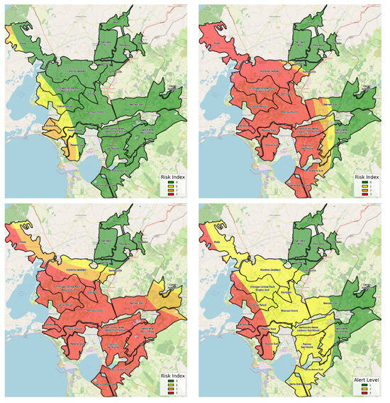 Risk indices (top, bottom left) and alert levels (bottom right) maps for the rice blast disease obtained from interpolated measured and forecast weather data. See Section 2.2.5 for details.