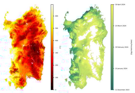 As for locusts, Figure 9 shows an example of the prediction model outcome: the cumulative sum of degree days (left) and the dates corresponding to egg hatching (right).
