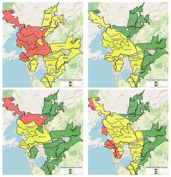 Comparison of observed and predicted alert levels for rice blast disease in the Oristano rice districts. Observed (top left) and predicted (top right) alert levels for 17 July 2023. Observed (bottom left) and predicted (bottom right) alert levels for 18 July 2023.