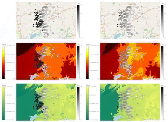 SMARTerra helps us understand the cause of this major misprediction. Analyzing Figure 11, middle left, it is evident that the red area corresponding to the dark-grey observations reaches the rainfall threshold at dates () approximately 3–4 weeks earlier than the orange area corresponding to the light-grey observations. This large difference in naturally affects the predicted egg hatching dates for (Figure 11, bottom left). In fact, the dark-green and light-green areas exhibit a significant difference of about 4–5 months. This can be explained as follows: since the accumulation of degree days is the summation of the difference, if positive, between the average daily temperature and the base temperature , the pixels in the dark-green area could continue accumulating during the still-warm days of October and November. In contrast, the summation for the pixels in the light-green area essentially halted during winter due to the low temperatures, requiring them to wait for the return of spring.