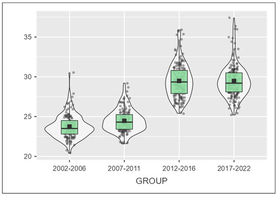 The girls’ trend showed a similar pattern. There was significantly lower agility over time (F(3,593) = 414, p < 0.001, ηp2 = 0.677). Girls reported the highest performance in the 2002–2006 Group (23.79 ± 1.53). Group 1 (2002–2006) exhibited a superior performance (23.79 ± 1.53) compared to Group 2 (2007–2011), Group 3 (2012–2016), and Group 4 (2017–2022) (at 24.54 ± 1.46, p = 0.009, d = 0.39 (0.15–0.63), 29.52 ± 2.16, p < 0.001, d = 3.09 (2.80–3.38), and 29.57 ± 2.12, p < 0.001, d = 3.09 (2.80–3.38), respectively). Similarly, Group 2 (2007–2011) also demonstrated a higher performance in contrast to Group 3 (2012–2016) and Group 4 (2017–2022) (p < 0.001, d = 2.70 (2.42–2.96) and p < 0.001, d = 2.71 (2.43–2.97), respectively), indicating a decline in results (Figure 2).