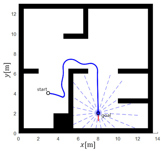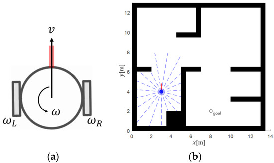 For evaluating the path planning algorithm, a mobile robot model, LiDAR sensor, visualization function, and maps provided by MATLAB 2022b’s Mobile Robotics Simulation Toolbox are utilized. Figure 1a,b shows the directions of the linear velocity and angular velocity of the robot and the environment of the Mobile Robotics Simulation Toolbox, respectively. The forward/inverse geometry of the robot is provided, and the position, posture, movement path, sensor measurement distance(the dashed blue lines), etc. of the robot are shown through the visualization function, as in Figure 1b. For the simulation, the radius of the wheel of the mobile robot is set to 0.1 [m], and wheelbase, which is the distance from the left wheel to the right wheel, is set to 0.5 [m]. The local coordinate system of the robot is fixed to the center of the robot. In the simulation environment, the LiDAR sensor is configured in a radial form, with the center of the robot as the origin. According to the user settings, the robot obtains obstacle information of up to 4 m at 19 points through the LiDAR sensor. LiDAR sensors are widely used to create maps or model and track objects using numerous measurement points. However, in this paper, since large amounts of data in the form of a cloud are not required, the LiDAR sensor is simulated by a low-cost ultrasonic sensor widely used in mobile robots. In the reference paper [32], 5–7 robot skeleton points are set, and the distance from each point to the obstacle is calculated and simulated. Although this paper also uses the LiDAR sensor supported by MATLAB’s Toolbox, it receives distance data by dividing 360 degrees into 19 points as if it were equipped with 19 ultrasonic sensors. Computation time can be saved by reducing the amount of processed data. The maximum measurement distance is set to 4 m. This study targets mobile robots that provide services in offices or commercial facilities. Accordingly, 4 m is considered the distance that people can feel as an open space in general indoor office environments. At too far a distance, the spacing between each sensor data increases, making it inappropriate to treat it as information about continuous obstacles. Reference [32] is referred to for the path planning and control process of the robot. All simulations are saved as figures, data files, and videos.