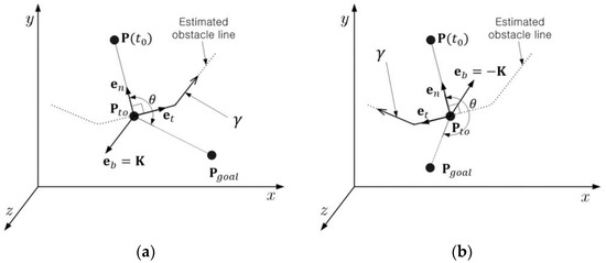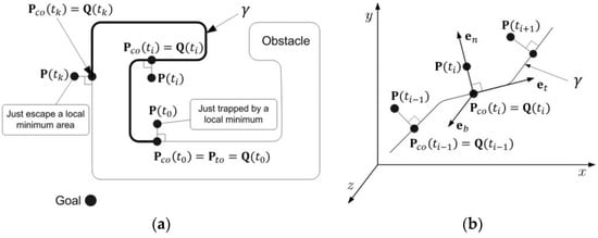 is defined as the path of the closest obstacles, indicating the trajectory of the closest obstacle while the robot is moving within the LM. The concept of is shown in Figure 2a [34]. is the time when the robot is trapped in the LM, and is the time when it escapes from the LM. is the position vector of the closest obstacle on the continuous trajectory. is the position vector of the closest obstacle measured discretely by the range sensor. represents a discrete sampling time of the range sensor. Assuming that is continuously interpolated and differentiable, can be written as follows.