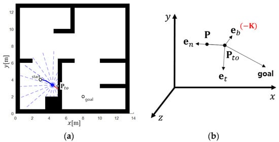 The virtual hill concept allows the robot to escape from the local minimum by generating extra force instead of attractive force when in the local minimum area. As explained in Section 3.1, the extra force follows the direction of the unit tangent vector of , which represents the trajectory of the nearest obstacle while the robot is moving within the local minimum. The unit tangent vector is determined as the cross product of the unit normal vector and the unit binormal vector . Since is the vector between the nearest obstacle and the robot, the decisive factor that determines the robot’s driving direction is . Unlike the previous determined according to the relative positions of the robot, the closest obstacle, and the goal, the proposed in this paper operates as an open path indicator. , which is determined by the shape of surrounding obstacles, makes the robot travel on a more open path, improving path efficiency.