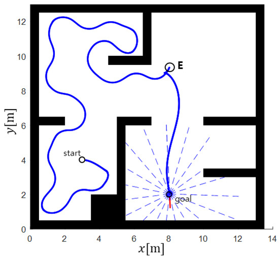 From the moment the robot is trapped in the LM to the moment of its escape, the artificial force applied to the robot is . In Equation (10), the first term of acts for a robot to move along the obstacle. The second term acts in the opposite direction to the repulsive force so that the robot does not move too far away from the obstacle. The extra force operates to move the robot along the outline of the obstacle until the robot escapes the LM without being too far away from the obstacle. In the previous virtual hill algorithm, was determined by the location relationship, and the form of the surrounding obstacle was not considered. Therefore, depending on the form of the map, the robot sometimes set an inefficient path. Figure 4 shows the moment when the robot is trapped in the LM, and is the position of the closest obstacle at the moment when it is trapped in the LM. According to Equation (14) used in the previous algorithm, has the direction. In the LM section, since indicating the driving direction is , the robot moves in the negative direction (clockwise). Eventually, it goes around the blocked path, as shown in Figure 5 (Point E is the moment it is determined that the robot has escaped the LM). Depending on which direction is selected at the moment when the robot is trapped in the LM, it may take quite a long path, or a dead path may be selected. Determining by considering only the relative positions, as in Equation (14), may complicate the movement path, as in Figure 5. Therefore, a more effective path planning algorithm that considers the form of obstacles is required.