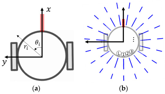 Local polar coordinate system with an origin at the center of the robot: (a) sensor measurement angle and detection distance ; (b) sensor data numbers (1L) and measurement angles.