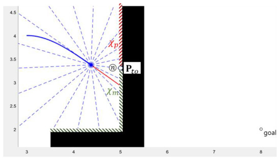 is the closest point from the robot to , and is always vertical to . The initial direction of is determined by . In order for the initial direction of to be directed toward goal, is defined as follows.