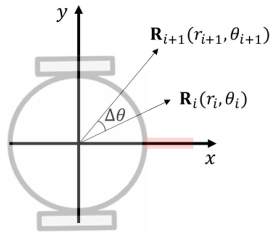In the simulation environment, the range sensor is configured in a radial form with the center of the robot as the origin. The degree of openness in both directions is estimated using the rate of change in the detection distance according to the measurement angle of each sensor data. In order to calculate the rate of change in the obstacle detection distance, it is expressed as a polar coordinate system fixed to the center of the robot. Figure 6 shows the polar coordinate system with the origin at the center of the robot and the angle of each sensor data set in the simulation. The angle and detection distance for each sensor data are expressed as and . At the moment when the robot is trapped in the LM, the rate of change in the outline of the obstacle is calculated for both the left and right directions based on the -th sensor data that measured . The one with the larger value is considered the open path and becomes the direction for the robot to move. When the contour of the two-directional obstacle is expressed as continuous functions and , the moment of the LM is shown in Figure 7. The differential lengths and in the polar coordinate system can be written as follows.