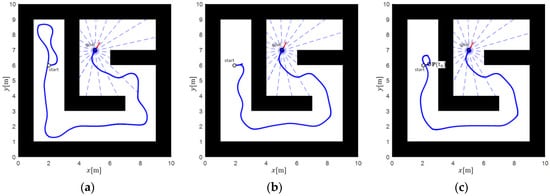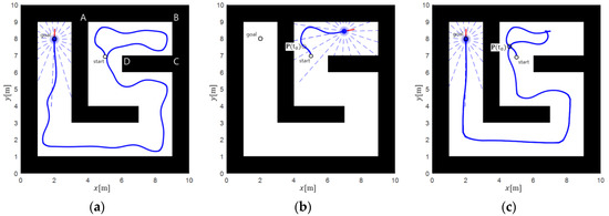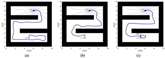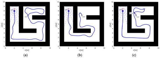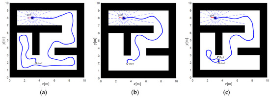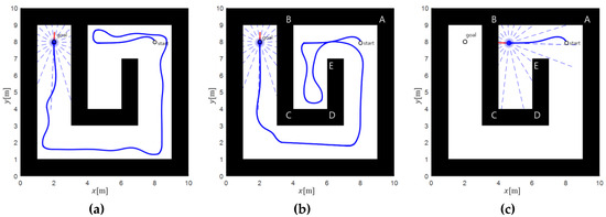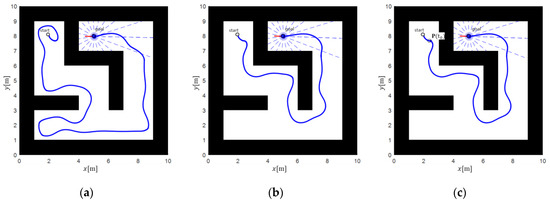 In Figure 20, (c) shows the moment of the LM, (a) shows the driving path determined by , and (b) shows the driving path determined by the . Using , is determined so that the robot may travel on a more open path. However, depending on the map, the direction that was the more open path may be blocked, as shown in Figure 20. The more open direction is the () direction when comparing () and () directions from the robot’s position shown in Figure 20c, but the robot eventually encounters a dead end. Nevertheless, there is no significant difference in path length between Figure 20a,b. In Figure 20a, the robot avoids the dead end using but follows obstacles far from the destination. In Figure 20b, the robot enters the dead end, but the path length is reduced by following obstacles closer to the destination due to .
