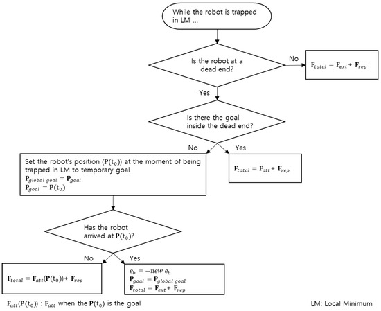 However, before arriving at the goal, the robot is trapped in local minima and stops driving when the attractive force and the repulsive force are the same or very similar. In [32], the virtual hill allows the robot to escape from the LM (local minimum) by generating an extra force instead of an attractive force when in the LM area. The artificial force, , applied to the robot from the moment of being trapped in the LM to the moment of escape, is . After the robot is out of the LM, = + is applied to move to the goal. Extra force can be applied even in complex environments and does not create a new local minimum. Extra potential is applied from the moment the robot is trapped in the LM until the escape is completed and is defined as follows.