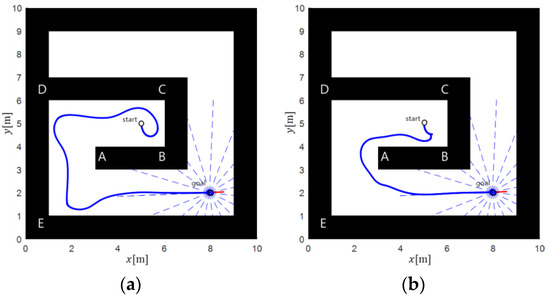 When the robot encounters a dead end while traveling to the destination, it is efficient to avoid it unless the destination is inside the dead end. When a robot encounters a dead end, if it is not on the way to its destination, it can avoid the dead end using the dead-end algorithm. Figure 10a shows the path planning results when is determined by . This is the path where the robot trapped in the LM at point moves to the destination along the obstacle ABCD section using the virtual hill technique. The ABCD section is a dead end and unnecessarily increases the robot’s travel distance and time. In this case, the robot can also come back through the dead-end algorithm just as people come back after confirming that it is a dead-end path.