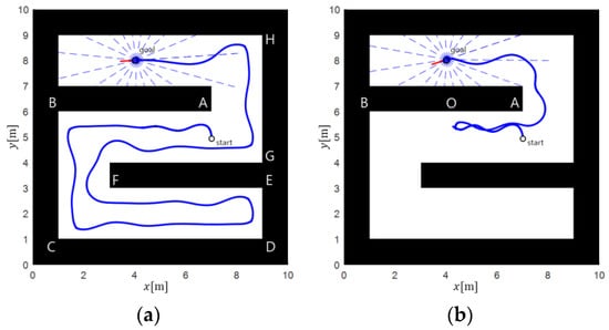 Figure 12 and Figure 13 show the results of the enhanced virtual hill algorithm. In the previous algorithm, when the robot is trapped in an LM (local minimum), the direction of progress is determined by the relative positions of , , and the goal. According to this algorithm, as shown in Figure 12a, the robot moves along the obstacle BCDE. On the other hand, when the enhanced virtual hill algorithm including is applied, the robot moves along the obstacle BA, as shown in Figure 12b. When the robot reaches the goal by following the obstacle BA, the efficiency of the driving path may be improved. In the case of Figure 13, according to the direction determination by the previous virtual hill algorithm, that is, , the robot goes around in the direction, as shown in Figure 13a. The robot moves along the obstacle ABCDEFGH until it escapes the LM. Since the path determined by goes to the goal along obstacle OA, unnecessary driving may be avoided. In Figure 13, the driving distance varies considerably depending on the direction determination at the LM.