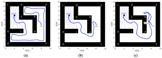Figure 14, Figure 15, Figure 16, Figure 17, Figure 18 and Figure 19 show the simulations of the driving path by and the dead-end algorithm. If the robot recognizes that it is at a dead end while driving in the LM section, it returns to the robot’s position . At , the robot moves in the opposite direction and follows a closer obstacle to its goal. In the case of Figure 14a, at the point of , it travels in the direction and travels along the obstacle ABCDEFGHI for a long distance. Figure 14b travels along the direction according to and travels the shortest distance along the obstacle BA. Figure 14c shows the result of applying the dead-end algorithm during driving, as shown in Figure 14a. After recognizing the obstacle BCDE as a blocked road, the robot returns to and moves in the direction of obstacle BA. In Figure 17c, as the robot rotates in the direction, the recognition of the blocked road, arrival at , and setting of the opposite direction occur almost simultaneously, drawing a path similar to that in Figure 17b without any special driving.