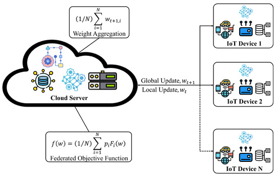 The Internet of Things (IoT) is revolutionizing various sectors by enabling massive data sharing and robust decision-making through connected devices. As a result, IoT scenarios are anticipated to generate large quantities of data in the near future [1]. To harness the potential of these data, researchers are investigating the feasibility of storing and processing them in cloud-based environments using advanced artificial intelligence techniques, such as deep learning and machine learning algorithms [2]. However, cloud-based data processing raises concerns about privacy and communication costs, which could potentially limit the benefits of such solutions [3]. Furthermore, IoT systems demand distributed intelligent services that can adapt to dynamic environments in real time, posing challenges due to the inherent complexity and heterogeneity of IoT devices. Researchers have proposed a multi-objective optimization technique using the Glowworm Swarm Optimization (GSO) algorithm and a hybrid optimization approach combining the artificial bee colony method, genetic operators, and density correlation degree to enhance the performance of blockchain-based Industrial Internet of Things (IIoT) systems [4,5]. Federated learning (FL), a distributed machine learning framework that ensures privacy, reduces data transfer, and solves device heterogeneity while allowing real-time adaptation to various contexts, has thus emerged as a solution to these problems [6].