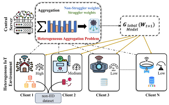 Scenario of heterogeneous FL in an IoT network environment. This study focuses on the heterogeneity in device specifications and the non-Independent and Identically Distributed (non-IID) nature of datasets among individual devices.