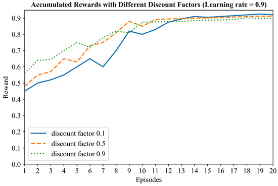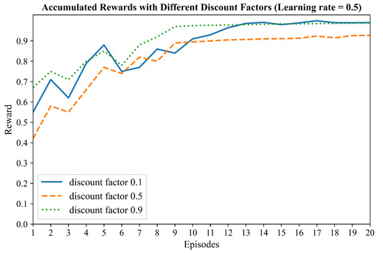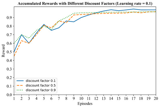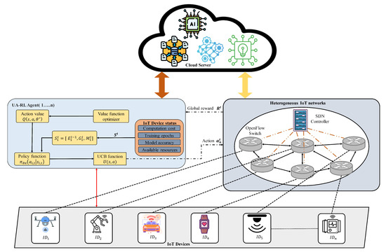 - Reward space: The reward function is used by the agent to evaluate the action taken to find the optimal action, i.e., the optimal epoch number. The UA-FedRL model’s reward is defined aswhere k is the model accuracy, is the loss value of the training model from the ith IoT device, and is the total cost of training the model on the ith IoT device. The global reward can be defined as